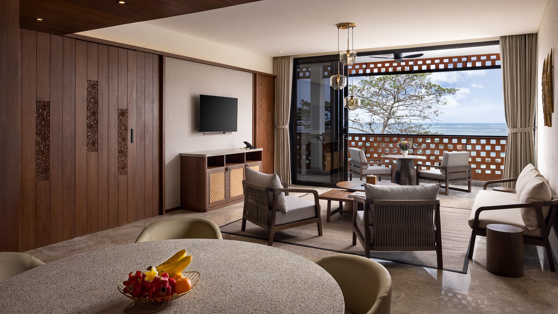 Wake up to panoramic ocean views through expansive windows that fill the room with natural light. Each suite features a private balcony, a cozy seating area, a luxurious en-suite bathroom, and all the modern comforts you need for a truly relaxing stay.